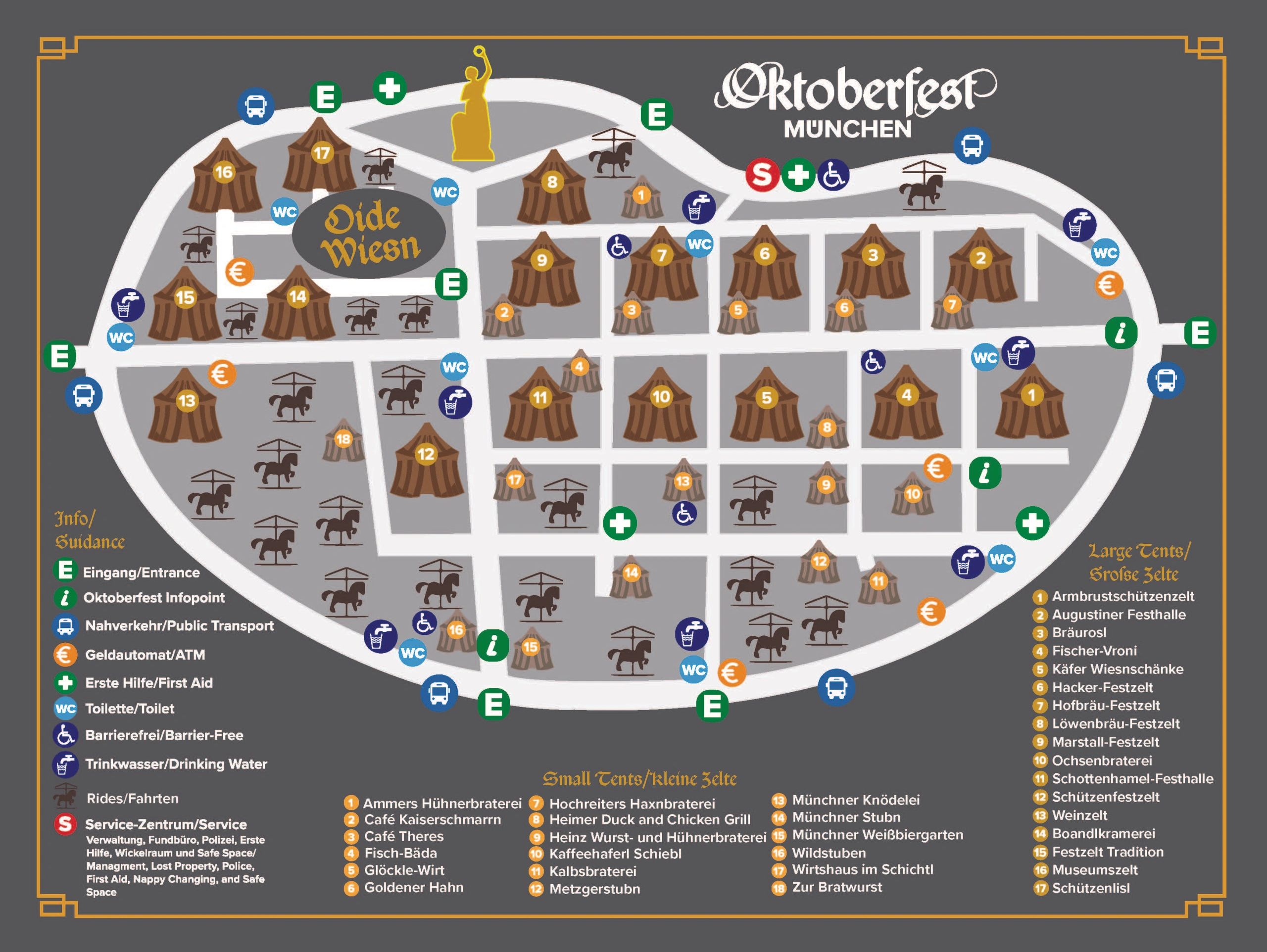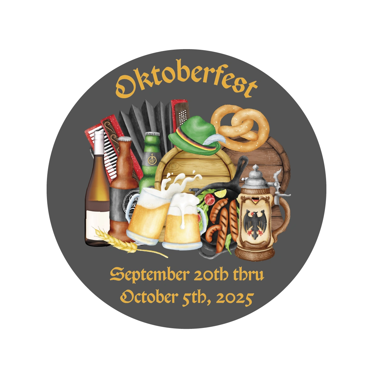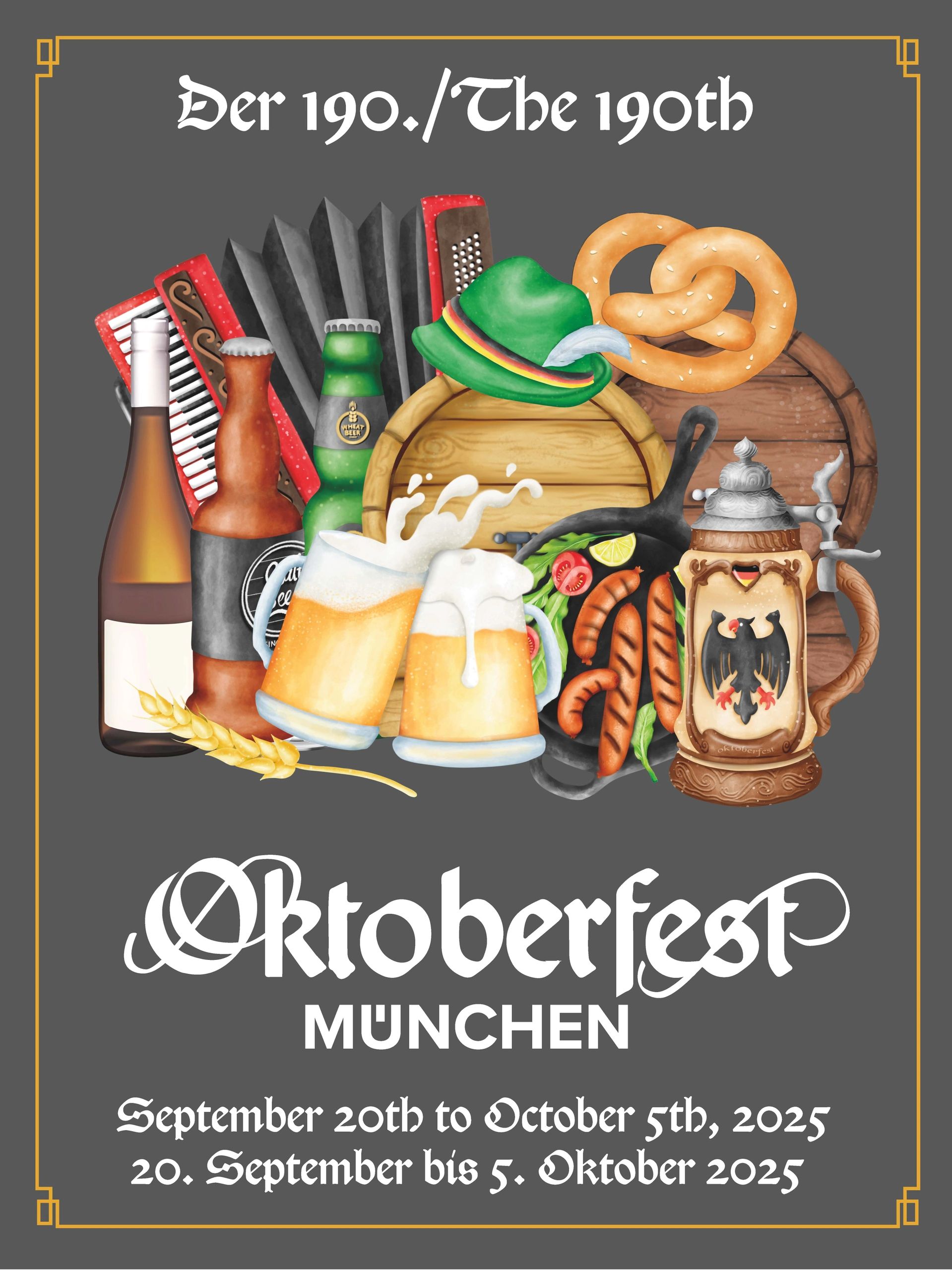 The Oktoberfest promotional package includes a 48-page booklet, two coupon sheets (one in English and one in German), a keepsake lanyard, a map designed to fit the aesthetic of the materials with a poster on the reverse side, and two bilingual stickers. The layout features English text in one direction and German in the opposite, meeting at a center spread of photos. The customized map enhances the experience, while the coupon sheets offer deals for admission to the Oide Wiesn, discounted beer, and ride fares. All items are packaged in a durable 7x9 inch white cardboard mailer for easy handling.